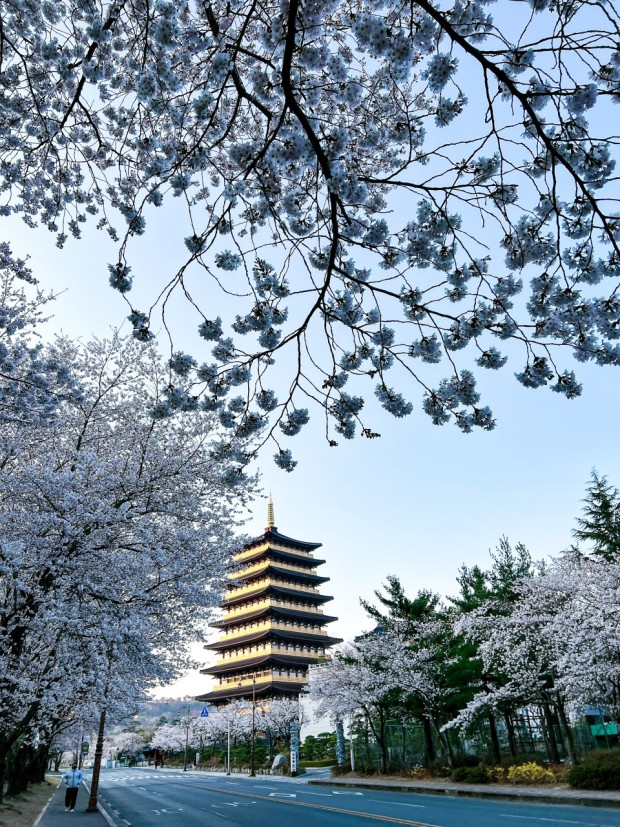 벚꽃과 황룡사탑이 한 장면에 담길 수 있도록 사진을 찍어봐요.