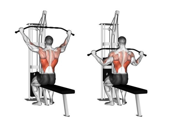 2. 바 당기기: 바를 가슴 높이나 목 뒤까지 당기며 팔꿈치를 몸 옆으로 내립니다.